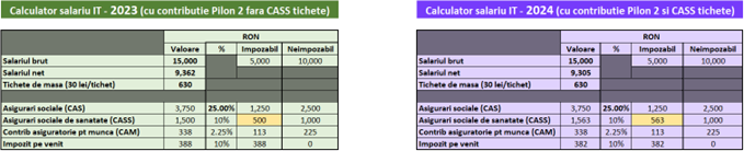 Cele 2 exemple prezinta calculul salariului aceluiasi angajat din sectorul IT care beneficiaza si de 21 de tichete de masa a cate 30 lei/tichet. Pentru anul 2023 (tabelul verde) se poate observa ca valoarea CASS-ului are ca baza de calcul doar salariul brut, in timp ce pentru anul 2024, baza de calcul se extinde si va cuprinde si valoarea tichetelor de masa. Drept urmare, CASS-ul platit in anul 2024 va fi cu 63 lei mai mult decat in 2023.