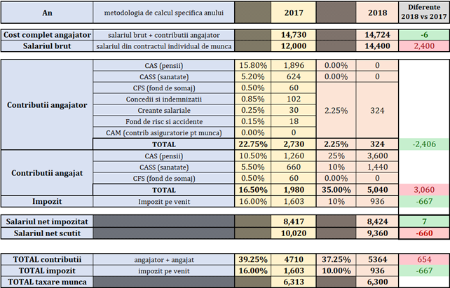 Exemplificăm în tabelul de mai jos diferențele de calcul dintre un salariu din 2017 și echivalentul său din 2018 :