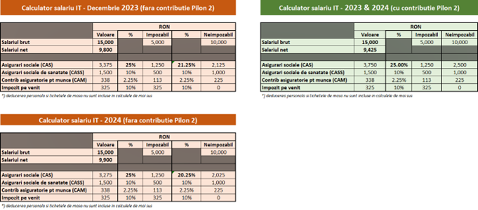 Mai jos sunt prezentate 3 exemple de calcul al venitului salarial pentru un angajat din sectorul IT, care beneficiază de scutirea impozitului pe venit, conform prevederilor Legii 296/2023 care au intrat în vigoare la 1 Noiembrie 2023. Tabelele din prima coloană au fost create plecând de la premisa că angajatul alege să nu mai contribuie la fondurile de pensii administrate privat. Astfel, valoarea CAS-ului (pentru veniturile sub 10.000 lei) se reduce cu procentul alocat contribuției la Pilonul 2 (3,75% pentru 2023 și 4,75% pentru 2024). Tabelul de culoare verde prezintă situația salarială pentru un angajat care alege să contribuie, în continuare, la fondurile de pensii administrate privat (în acest caz nu mai este aplicată reducerea cotei CAS).