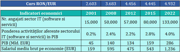 Dupa cum se poate vedea si in tabelul de mai jos (pentru 2001 sunt prezentate date estimative conform expunerii de motive din OG7/2001), la sfarsitul anului 2022, sectorul IT din Romania este evaluat undeva 8,8 miliarde de EUR reprezentand aproximativ 4% din PIB (conform studiului ANIS), cu o rata de crestere anuala de 15-17% (intre anii 2015 si 2020), de trei ori mai rapida decât media națională. Desi numarul de angajati din sectorul IT (software si servicii) creste cu 890% intre 2001 si 2022, ponderea activitatilor acestui sector din PIB a inregistrat o apreciere de 2000% in timp ce PIB-ul tarii a crescut cu aprox. 630%. Astfel, se poate concluziona ca ritmul de crestere a sectorului IT in economia Romaniei sau a importantei acestuia este semnificativ mai rapid decat evolutia economica a tarii, per ansamblu.